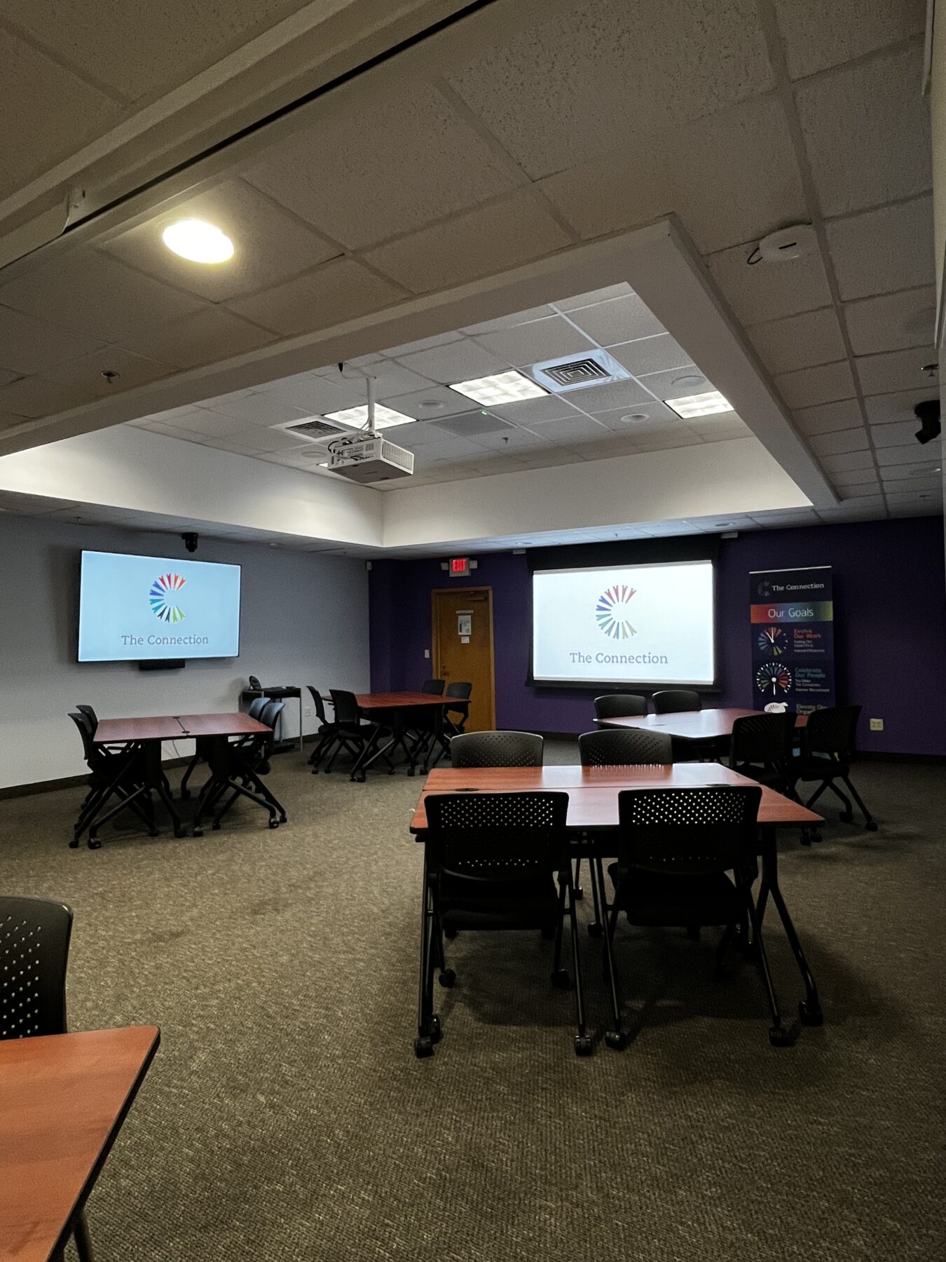 “We wanted to upgrade our in-person and hybrid training space with better resources – it’s been on our wish list for a while,” notes Christina Liuzzo, The Connection’s Director of IT.  “This grant funding enabled us to upgrade all the networking equipment at our different sites, get a lot of new computers and upgrade the training rooms.  The new displays and audio are a major improvement from the monitors mounted on rolling carts we used before.”